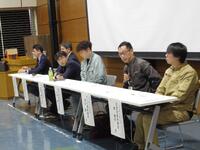 協議会会長鈴井様のご挨拶に続き「林業ってどんな仕事」について、トークセッションが行われました。林業に関わる5つの事業体の方々にパネリストとして生徒からの質問に現場の実際の経験を通して、説明をしていただく内容です。