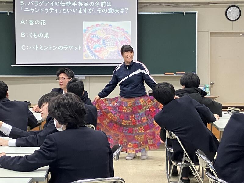昨年の交流授業を振り返りつつ、パラグアイでの生活や伝統文化、現地の農業高校の様子などについてクイズを交えて楽しくお話しいただきました。